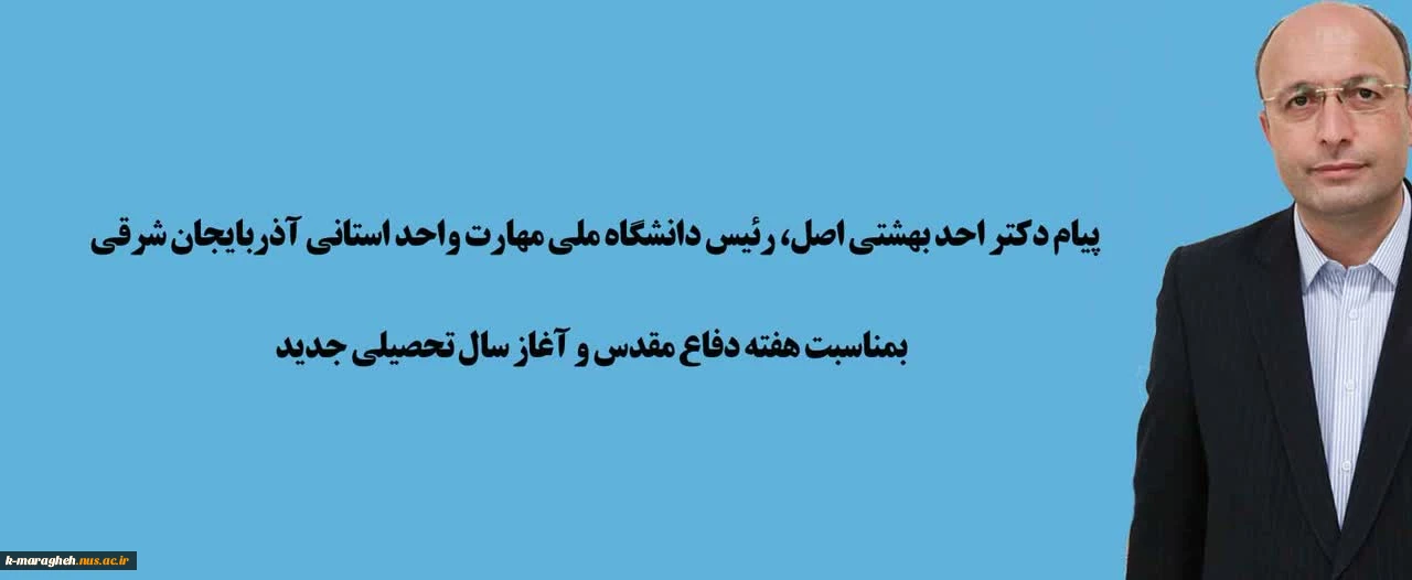 امتیاز دهید : پیام تبریک دکتر احد بهشتی اصل، رئیس دانشگاه ملی مهارت واحد استانی آذربایجان شرقی به مناسبت هفته دفاع مقدس و آغاز سال تحصیلی جدید 2 شنبه 5 مهر 1404 ساعت 11:19