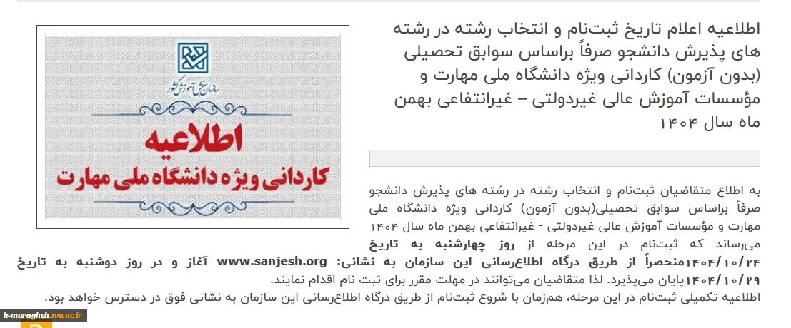 امتیاز دهید : اطلاعیه مهم در خصوص ثبت نام ورودیهای 1404 مقاطع کاردانی و کارشناسی در آموزشکده ملی مهارت واحد مراغه 5 چهارشنبه 24 دی 1404 ساعت 10:04